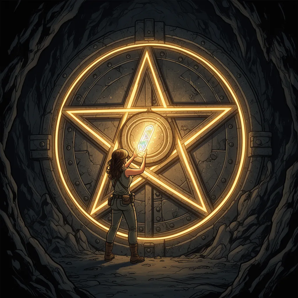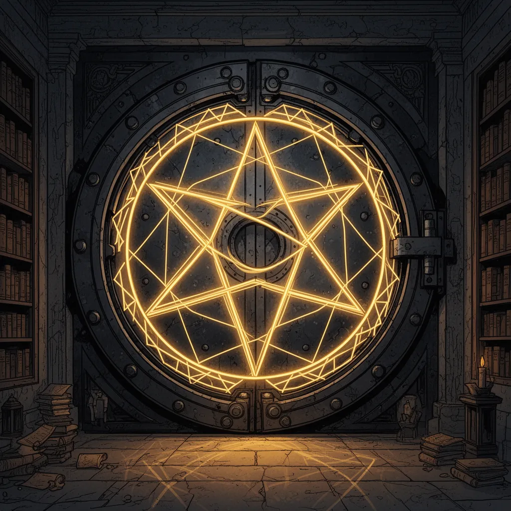 An der gegenüberliegenden Wand befand sich eine riesige, kreisrunde Tresortür aus einer dunklen Metalllegierung. Über die gesamte Fläche der Tür erstreckte sich ein gewaltiges, leuchtendes Symbol: Ein fünfzackiger Stern, ein sogenanntes Pentagramm, das exakt von einem regelmäßigen Fünfeck umschlossen wurde.
