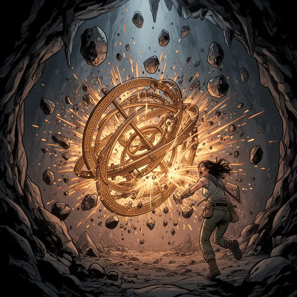 Elenas Augen weiteten sich, als die zentrale Achse der Maschine unter dem gewaltigen Druck nachgab. Mit einem ohrenbetäubenden Knall barst das antike Wunderwerk. Riesige Zahnräder rissen aus ihren Verankerungen, Bronzekugeln schossen wie Kanonenkugeln durch den Raum und zerschmetterten die marmornen Säulen. Ein glühender Funkenregen ergoss sich über das Pult.