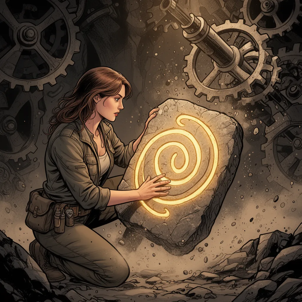 Vor ihr befand sich kein gewöhnliches Schloss, sondern ein steinernes Rätsel. In die massive Türschräge war eine tiefe Vertiefung in Form eines rechtwinkligen Dreiecks gemeißelt. Zwei Seiten des Dreiecks waren bereits mit massiven Bronzeleisten ausgefüllt. Die dritte, längste Seite war leer. Daneben lagen mehrere schwere Bronzestäbe in unterschiedlichen Längen. Elena wusste: Setzte sie den falschen Stab ein, würde ein uralter Mechanismus die Höhle zum Einsturz bringen.