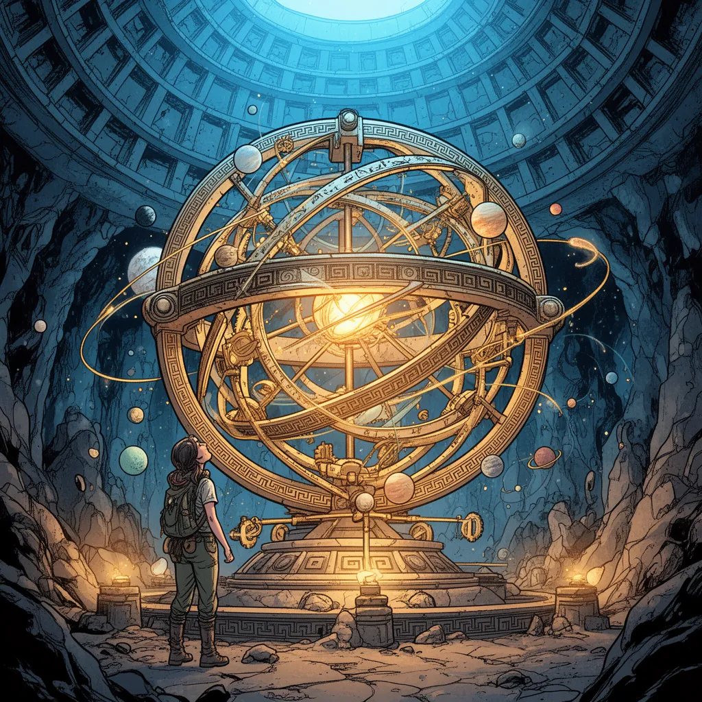 Sie trat in das absolute Allerheiligste. Der Raum war eine perfekte Halbkugel. Die Decke war übersät mit leuchtenden Punkten – einer antiken Sternenkarte aus eingelassenen Edelsteinen. Doch das Herzstück des Raumes raubte Elena den Atem. In der Mitte schwebte scheinbar eine gigantische Konstruktion aus ineinandergreifenden Ringen, Zahnrädern und Bronzekugeln. Es erinnerte an das berühmte Uhrwerk von Antikythera, war aber viel älter und von einer erschreckenden Eleganz.